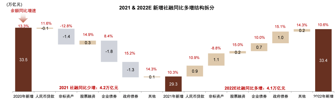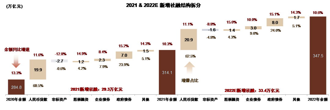 图表20:我们预计2022年社融增速能保持稳定,新增社融约33.4万亿元