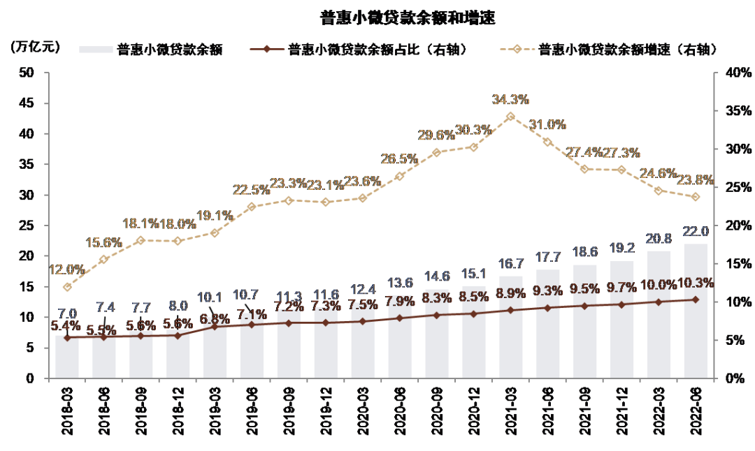 普惠小微贷款增速连续第5个季度回落,主要由于普惠覆盖面已经较高,增速回归常态。今年4月普惠小微企业贷款余额环比下降约900亿元,主要由于疫情影响。为此,银保监会印发了42条助企纾困政策通知,5月/6月份普惠型小微企业贷款增量达到3300亿元/9300亿元,扭转了4月下跌势头。