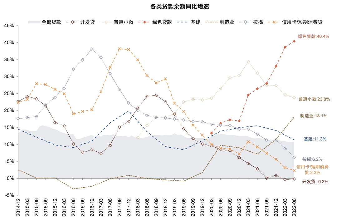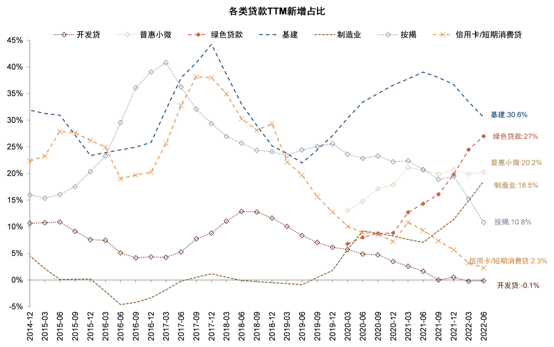 信贷结构向绿色/普惠/基建/制造业调整。我们根据贷款投向数据估算2Q22绿色/普惠/制造业/基建贷款余额增速为40.4%/23.8%/11.3%/18.1%,增量占全部贷款约27.0%/20.2%/30.6%/18.5%。其中: