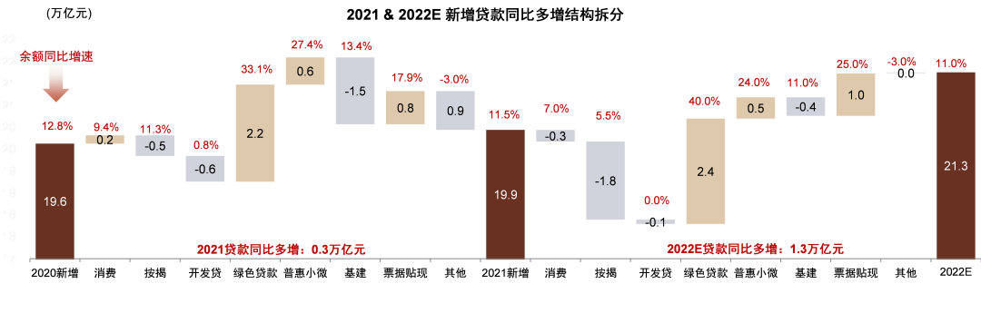 图表19:我们预计2022年贷款同比多增1.3万亿元,主要贡献来自于绿色、普惠及票据贴现