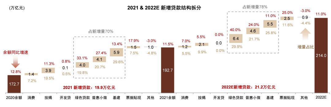 图表18:我们预计2022年新增贷款约21万亿元,主要贡献来自于绿色贷款、普惠小微和基建贷款