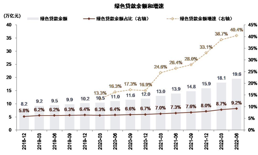 绿色贷款增速创新高,主要由于新能源行业景气度较高、贷款需求较强。其中,投向具有直接和间接碳减排效益项目的贷款合计占绿色贷款的66.2%;基础设施绿色升级/清洁能源/节能环保贷款余额同比分别增长32.2%/40.8%/62.8%。