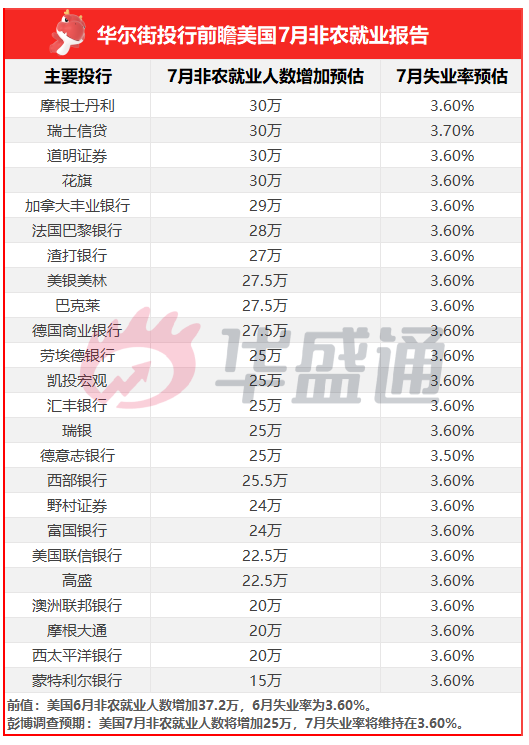 1、华尔街投行前瞻:美国7月非农就业人数增长将进一步放缓