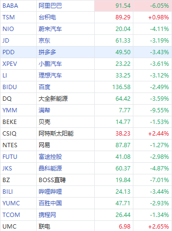 华盛资讯8月5日消息,热门中概股今日集体走跌,满帮大跌超9%,阿里巴巴跌超6%,蔚来汽车跌超4%,小鹏汽车、拼多多、京东跌超3%。芯片股逆市上扬,联电涨超2%,台积电涨近1%。
