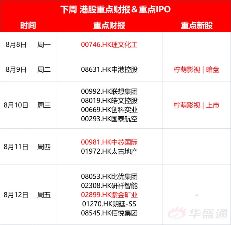 下周港股迎来多家行业巨头公布财报,其中周四四中芯国际发布财报,周五紫金矿业发布财报,新股方面,腾讯持股的柠萌影视周二公布中签及暗盘,周三上市。