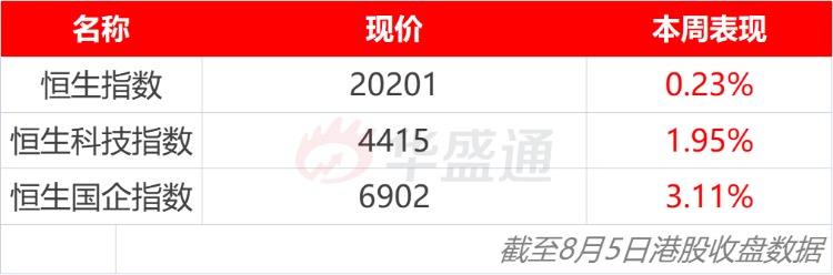 恒生指数本周涨0.23%,报20201点;恒生科技指数本周涨1.95%,报4415点;国企指数本周跌3.11%,报6902点。