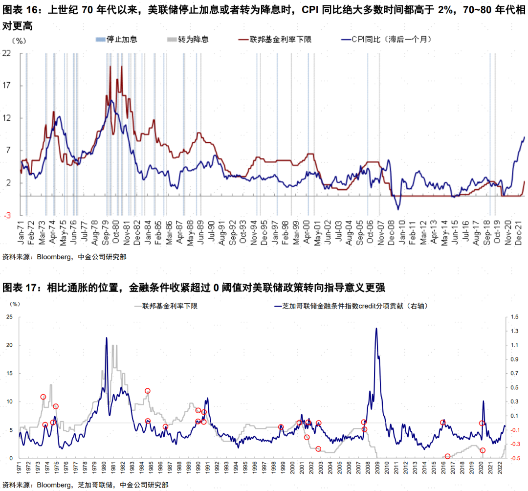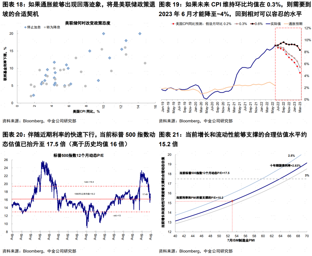 ►基准情形下通胀逐步改善,9月后快速回落,但中间或有“变数”。近期油价大跌下的通胀压力缓解预期,也是市场预期美联储能在增长压力下逐步退坡甚至降息的主要原因之一。下周公布的7月通胀环比有望明显缓解(Bloomberg一致预期预计环比0.2%,对比上个月的1.3%),但因为缺乏高基数,因此同比的快速回落可能要等到9月份之后。由于当前通胀过高,因此可持续的通胀风险下降仍是政策转向必要条件。根据克利夫兰联储预测,2023年通胀将降至3.3%。根据我们推算,如果环比维持在0.3%,CPI同比2023年6月有望降至~4%;如果环比为0.2%,同比2023年3月或回到~4%,因此9月后可能是美联储确切退坡的观察契机。