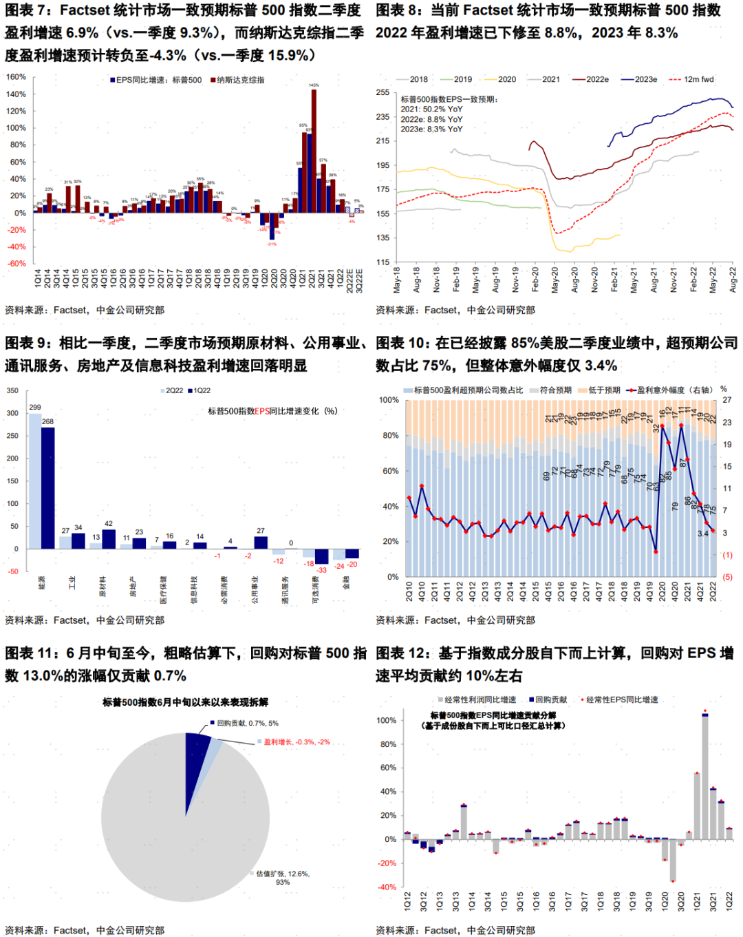 由于业绩期期间是回购的静默期,因此也并非市场主要贡献。6月中旬以来,标普500成分股中有31家公司宣布回购,占比较小。粗略估算,6月中旬以来,标普500指数静态EPS增长0.4%,而净利润下滑0.3%,二者之间差距可以近期视为部分回购的增厚效果。实际上,如我们在《加息如何影响美股回购?》中分析,从过去10年历史经验看,回购对美股EPS增速贡献平均仅占~10%,对市场贡献~5%,都不算高,尽管作为回购主力军的科技和金融占比相对更大(占比可达20%左右),但显然都不是本轮市场反弹的主导因素。值得注意的是,6月33家美国大型银行通过年度的压力测试,但摩根大通和花旗等银行都表示将暂停回购计划,以满足美联储压力测试后更高的资本要求 。