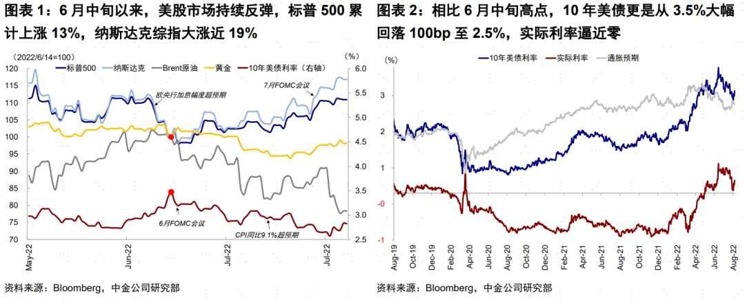 6月中旬以来,美股市场持续反弹,标普500累计上涨13%,纳斯达克综指大涨近19%。与此同时,10年美债更是从3.5%大幅回落100bp至2.5%,实际利率逼近零。美股和美债市场的这一走势明显超出市场多数参与者的预期,要知道6月中旬,对于美股可能进一步大跌、以及长端美债利率可能攀升至4%的声音还是主流。虽然我们并不预计美股会进一步大跌、且10年美债在3.5%左右,但是如此快速的反弹修复也是超出我们预期的。