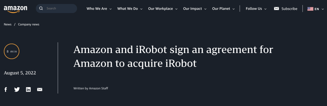 智东西8月6日消息,就在昨日晚间,亚马逊官宣将斥资17亿美元(折合约114.96亿人民币)收购全球扫地机器人鼻祖iRobot,该交易会以全现金形式完成。