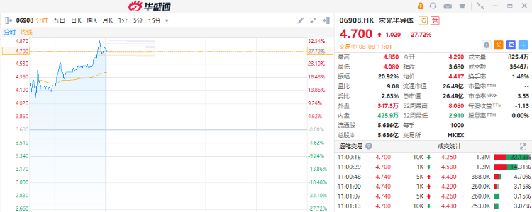宏光半导体(6908.HK)复牌涨28.8%,报4.70港元,总市值26亿港元。