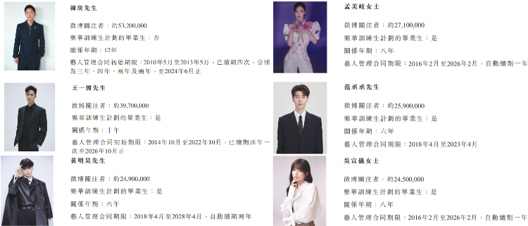 截至最后实际可行日期,公司拥有韩庚、王一博、孟美岐、范丞丞、黄明昊、吴宣仪等66名签约艺人,并成功推出UNIQ、NEXT、EVERGLOW、NAME、TEMPEST等艺人组合。此外,公司于2020年合作推出包含五名成员的虚拟艺人女团A-SOUL。