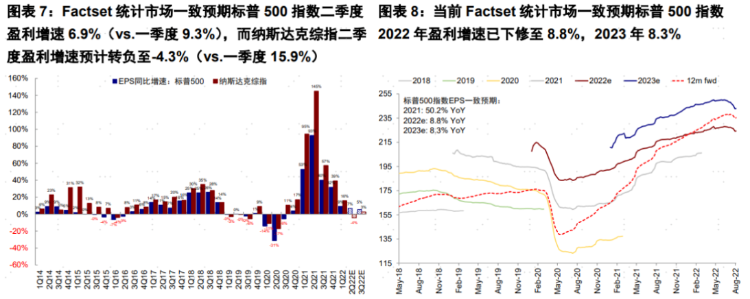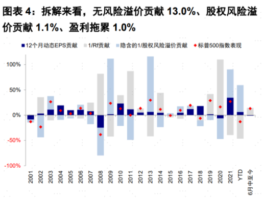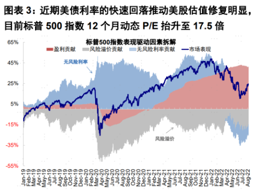 用简单的宏观经济学知识来分析一下货币市场现状,在衰退担忧的升温和美联储紧缩趋缓下,长端美债利率特别是实际利率快速下行。6月17日美股触底以来,标普500累计上涨13%,其中估值(12个月动态P/E)扩张14.2%;其中估值扩张中无风险利率下行贡献13%,远超于股权风险溢价变动贡献的1.1%。因此我们不难看出,近期美股上涨的主导因素是利率下行驱动的估值修复。