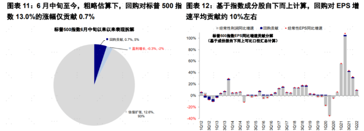 答案也是否定的。因为公司回购行为会受到业绩期期间公司披露业绩前后静默期(blackout)的影响,而本轮反弹适逢静默期,因此也并非市场主要贡献。6月17日美股触底以来,标普500指数静态EPS增长0.4%,而净利润下滑0.3%,二者之间差距可以近期视为部分回购的增厚效果。从过去10年历史经验看,回购对美股EPS增速贡献平均仅占10%,对市场贡献5%,显然都不是本轮市场反弹的主导因素。