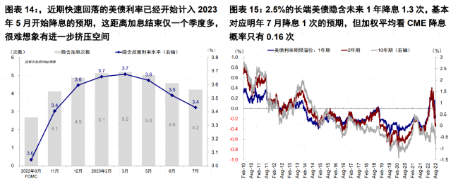 “”透支“则是指降息预期过于前置、且很难有进一步压缩空间。目前的高通胀使美联储很难停止紧缩步伐。然而,相比基准情形下四季度才能退坡、年底可能完成的加息任务,近期快速回落的美债利率已经开始计入2023年5月开始降息的预期,这距离加息结束仅一个季度多,很难想象有进一步挤压空间。因此,不论如何,我们认为除非接下来通胀大幅回落、又或者增长显著滑坡,短期2.5%的美债利率很难进一步大幅回落,给市场估值或者黄金提供支撑。