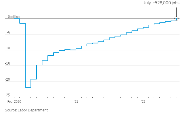 尽管7月份新增了惊人的52.8万个就业岗位,但这仅仅相当于美国劳动力市场的一个经济里程碑,即完全恢复到疫情前的就业水平。2020年2月,美国就业人口为15250.4万人;2022年7月,美国就业人口为15253.6万人。