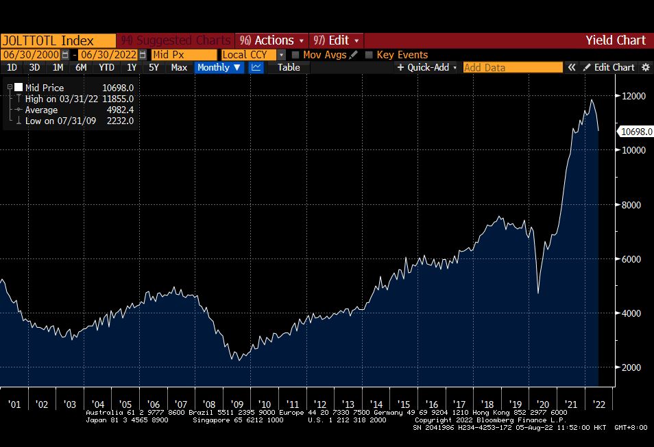 然而,就业数据并不是一个领先指标,就算不是滞后指标,也顶多是一个同步指标。美国劳工部公布的JOLTS(职位空缺和劳动力流动调查报告)在3月31日达到1185.5万人的峰值,在6月30日降至1069.8万人。上周,美国劳动力市场的首次申请失业救济金人数达到八个月高点,这是一个更好的就业状况指标。
