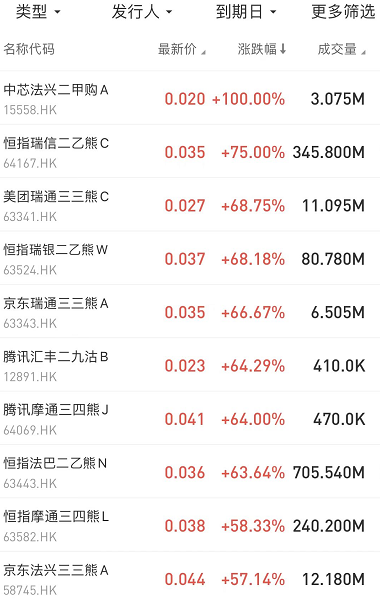 在今日涨幅榜中,中芯法兴二甲购A $15558.HK 涨100.00%;恒指瑞信二乙熊C $64167.HK 涨75.00%,美团瑞通三三熊C $63341.HK 涨68.75%。