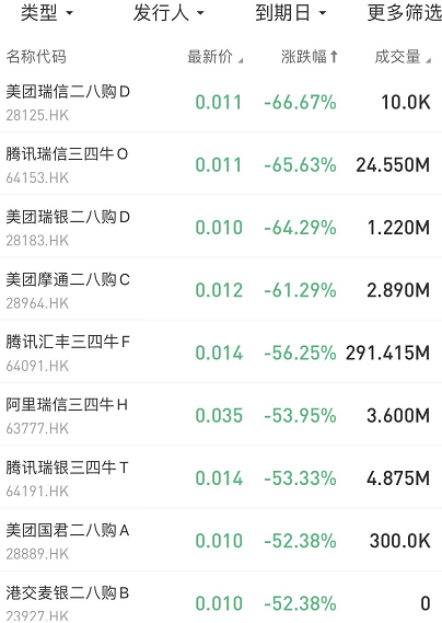 在今日跌幅榜中,美团瑞信二八购D $28125.HK 跌66.67%;腾讯瑞信三四牛O $64153.HK 跌65.63%。