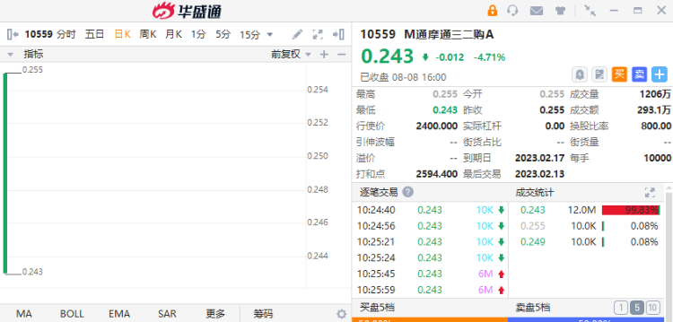 如在华盛通APP可以看到,名称带有M通的就是MSCI A50的衍生品。举例购证来说,M通摩通三二购A $10559.HK 是一只2022年8月8日上市,2023年2月17日到期的购证,最后交易日为2023年2月13日。M通摩通三二购A今日跌4.71%,收于0.243港元。