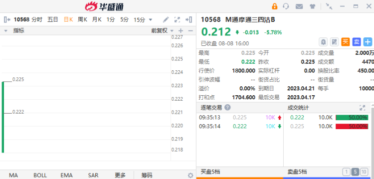 举例沽证来说,M通摩通三四沽B $10568.HK 是一只2022年8月8日上市,2023年4月21日到期的购证,最后交易日为2023年4月17日。M通摩通三四沽B今日跌5.78%,收于0.212港元。