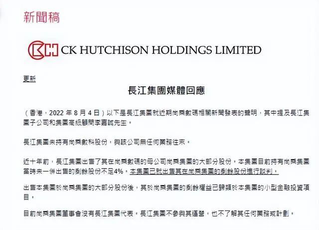 声明介绍,近十年前,长江集团出售了其在尚乘数科母公司尚乘集团的大部分股份。目前持有尚乘集团当时未一并出售的剩余股份不足4%。集团已就出售其在尚乘集团的剩余股份进行谈判。