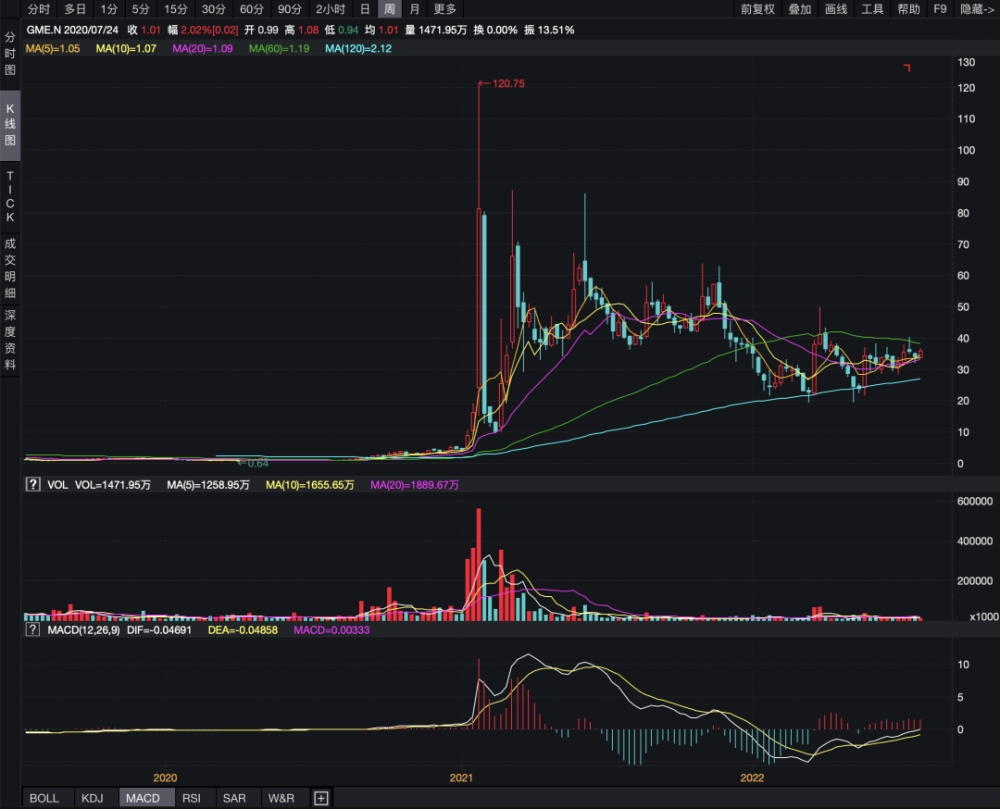2020年末,股价仅有4.7美元的 GameStop 在2021年1月开始大涨,股价一度达到483美元。但随后 GameStop 股价急速回落,后又几经起落。截至8月2日收盘,GameStop 股价为35.84美元,市值109亿美元。