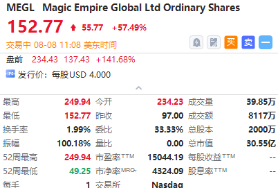 华盛资讯8月8日消息,Magic Empire Global $MEGL 盘中涨57.49%,现报152.77美元,总市值30.55亿美元。该股上周五上市首日一度暴涨5262.5%,是一家香港金融服务提供商,主要从事提供企业融资咨询服务和承销服务。