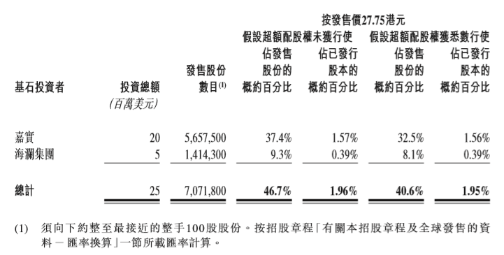 基于发售价每股发售股份27.75港元,且根据基石投资协议,基石投资者已认购合共707.18万股发售股份,合共占(于各情况下假设超额配股权未获行使)紧随全球发售完成后公司已发行股本总额的约1.96%,及全球发售项下发售股份数目的约46.7%。