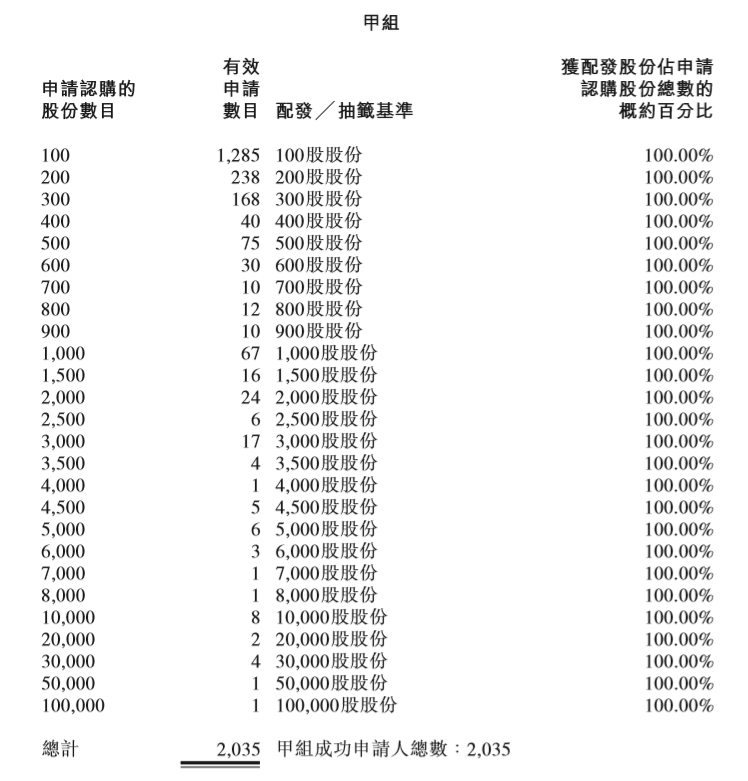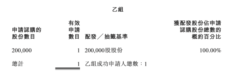 其中,香港公开发售项下初步发售的香港发售股份认购不足。合共接获2036份根据香港公开发售通过网上白表服务及通过中央结算系统EIPO服务提出的有效申请,认购合共122.21万股香港发售股份,相当于香港公开发售项下初步可供认购151.4万股香港发售股份总数的约0.81倍。