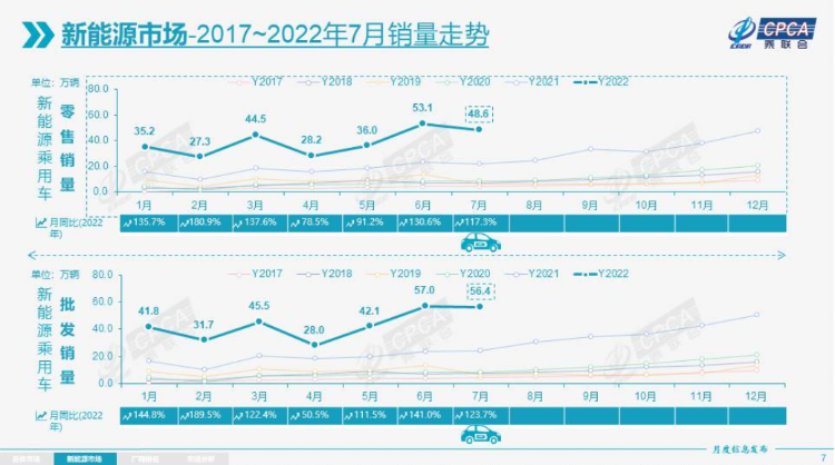7月新能源乘用车批发销量达到56.4万辆,同比增长123.7%,环比下降1.1%。