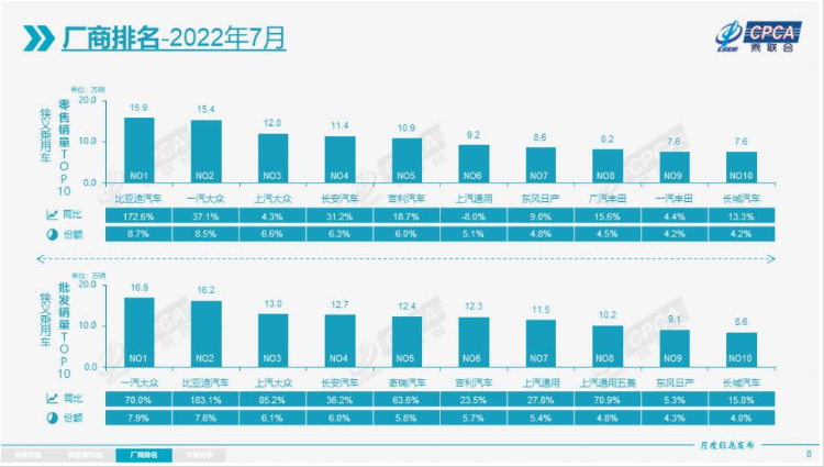 4) 车企:7月新能源乘用车市场创历史新高,比亚迪纯电动与插混双驱动夯实自主品牌新能源领先地位;以奇瑞集团与广汽集团为代表的传统车企在新能源板块表现相当突出。在产品投放方面,随着自主车企在新能源路线上的多线并举,市场基盘持续扩大,厂商批发销量突破万辆的企业有16家(环比持平,同比增加了11家),占新能源乘用车总量83.4%。其中:比亚迪162,214辆、上汽通用五菱59,336辆、吉利汽车32,030辆、特斯拉中国28,217辆、广汽埃安25,033辆,奇瑞汽车24,753辆,长安汽车22,286辆、上汽乘用车19,867辆、上汽大众14,564辆、哪吒汽车14,037辆、一汽大众13,185辆、零跑汽车12,044辆、小鹏汽车11,524辆、长城汽车10,994辆、理想汽车10,422辆、蔚来汽车10,051辆。