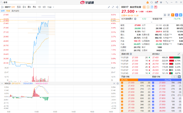 华盛资讯8月9日消息,香港本地地产股拉升走强,新世界发展涨5.36%,报27.5港元每股;恒基地产涨超4%,新鸿基地产、长实集团涨超3%。