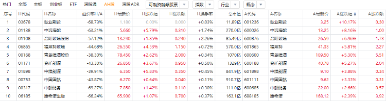 截至发稿,弘业期货A股涨10.17%,H股平盘;中远海能A股涨8.16%,H股现涨5.79%;洛阳玻璃股份A股涨6.96%,H股现涨1.85%。