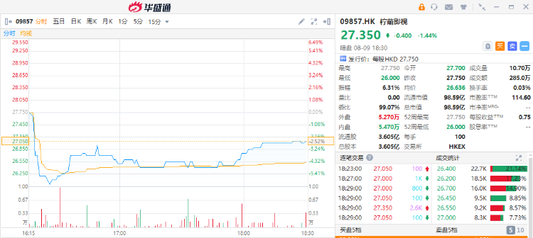 华盛资讯8月9日讯,影视剧集制作公司柠萌影视 $09857.HK 暗盘收跌1.44%,最新总市值超98亿港元。该股预计将于明日(8.10)正式港股挂牌上市。
