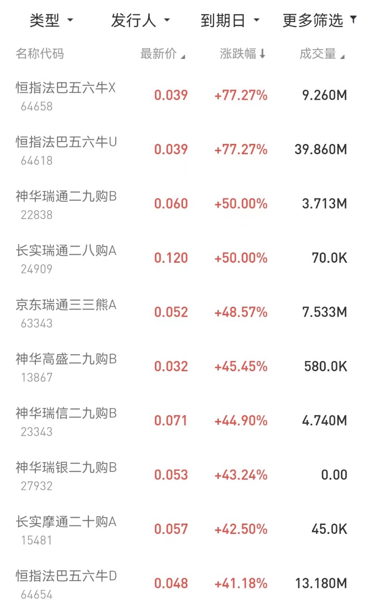 在今日涨幅榜中,恒指法巴五六牛X $64658.HK 涨77.27%;神华瑞通二九购B $22838.HK 涨50.00%,京东瑞通三三熊A $63343.HK 涨48.57%。