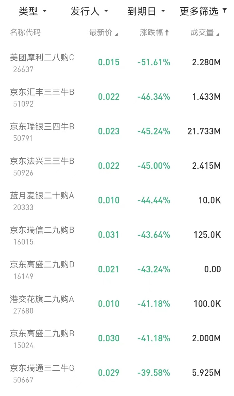 在今日跌幅榜中,美团摩利二八购C $26637.HK 跌51.61%;京东汇丰三三牛B $51092.HK 跌46.34%。