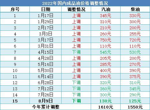 此次下调策落实之后,2022年成品油调价将呈现“10涨5跌0搁浅”格局。至此,汽、柴油价格今年分别累计上涨1610元/吨、1550元/吨,折升价92号汽油、95号汽油、0号柴油分别为1.26元、1.34元、1.32元。下一次调价窗口将在2022年8月23日24时开启。