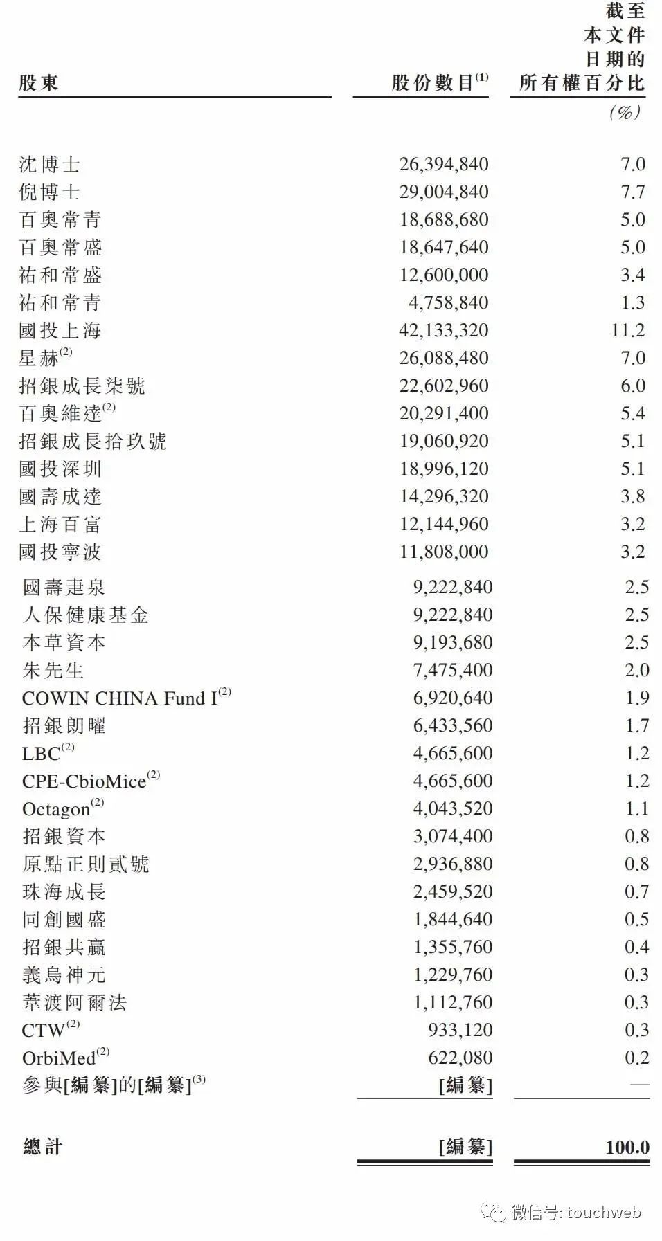 上海百富、国投宁波分别持股为3.2%,国寿疌泉、人保健康基金、本草资本分别持股为2.5%,同创国盛持股为0.5%,OrbiMed持股为0.2%。