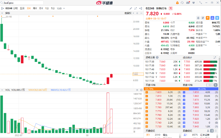 截至发稿,快狗打车现涨12.68%,股价报7.82港元每股,最新总市值48亿港元。