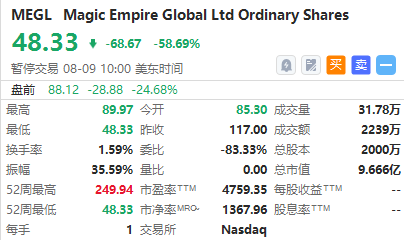 华盛资讯8月9日消息,中概股智富融资 $MEGL 跌58.69%,盘中多次触发熔断,该股上市首日一度暴涨50倍。据悉,智富融资是中国香港的金融服务供应商,主要从事提供企业融资顾问服务及包销服务。
