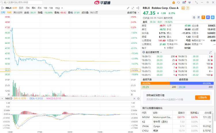 财报公布后,截至发稿,Roblox盘后跌16.92%,报39.34美元。该股已较去年11月134.72美元的高点下跌了70%。