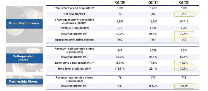 门店数方面,瑞幸咖啡Q2新增615家,总数达到7159家,自营门店同店销售额增长41.2%。