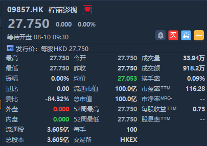华盛资讯8月10日讯,影视剧集制作公司柠萌影视 $09857.HK 首挂平开,昨日暗盘收跌1.44%,今日盘前成交额918万港元,最新总市值100亿港元。