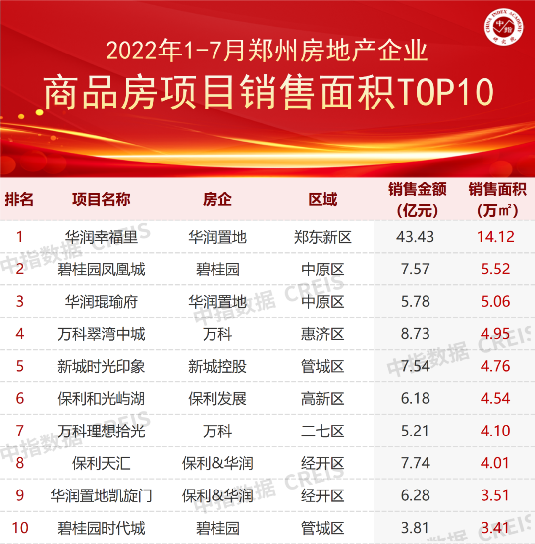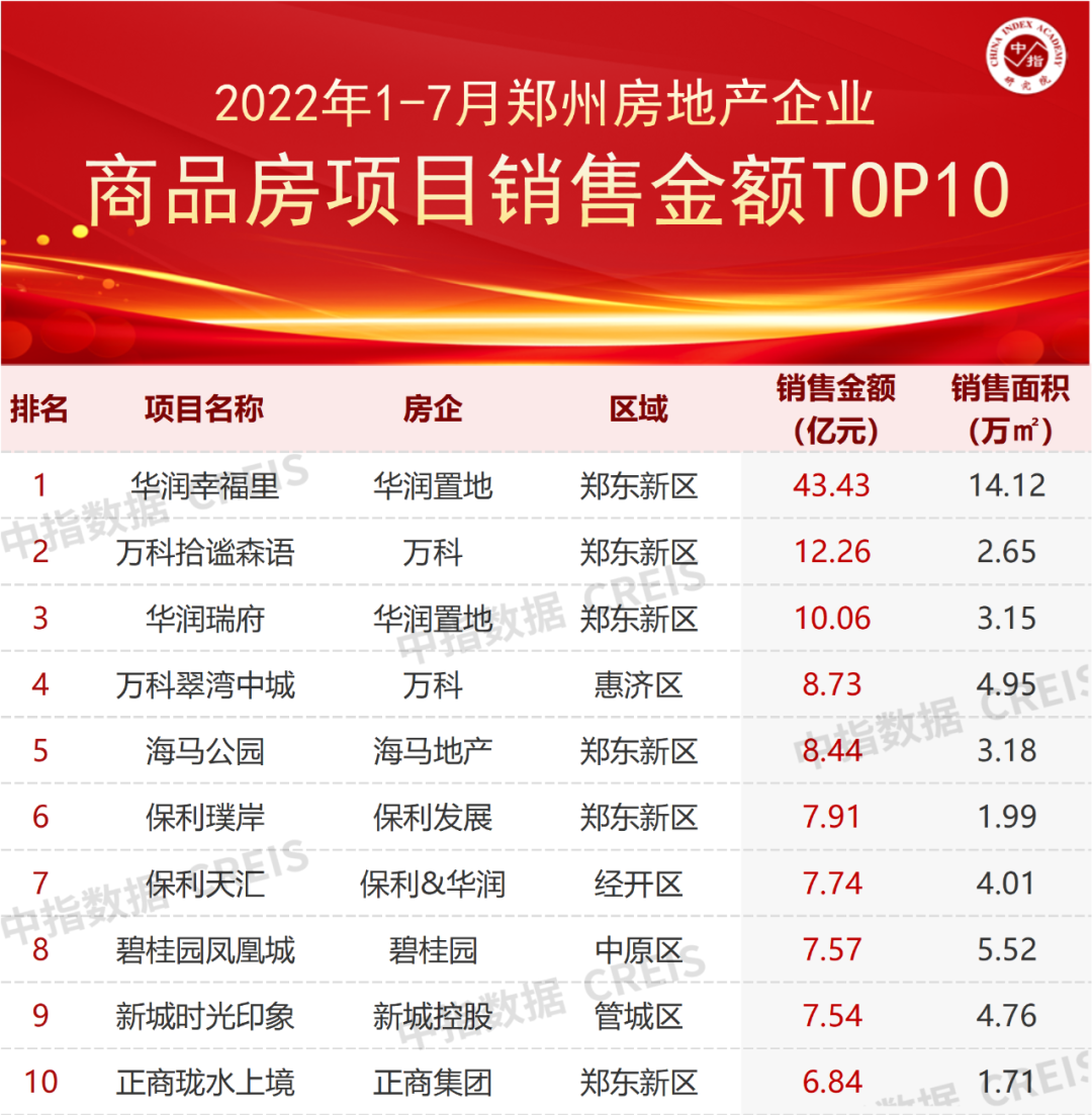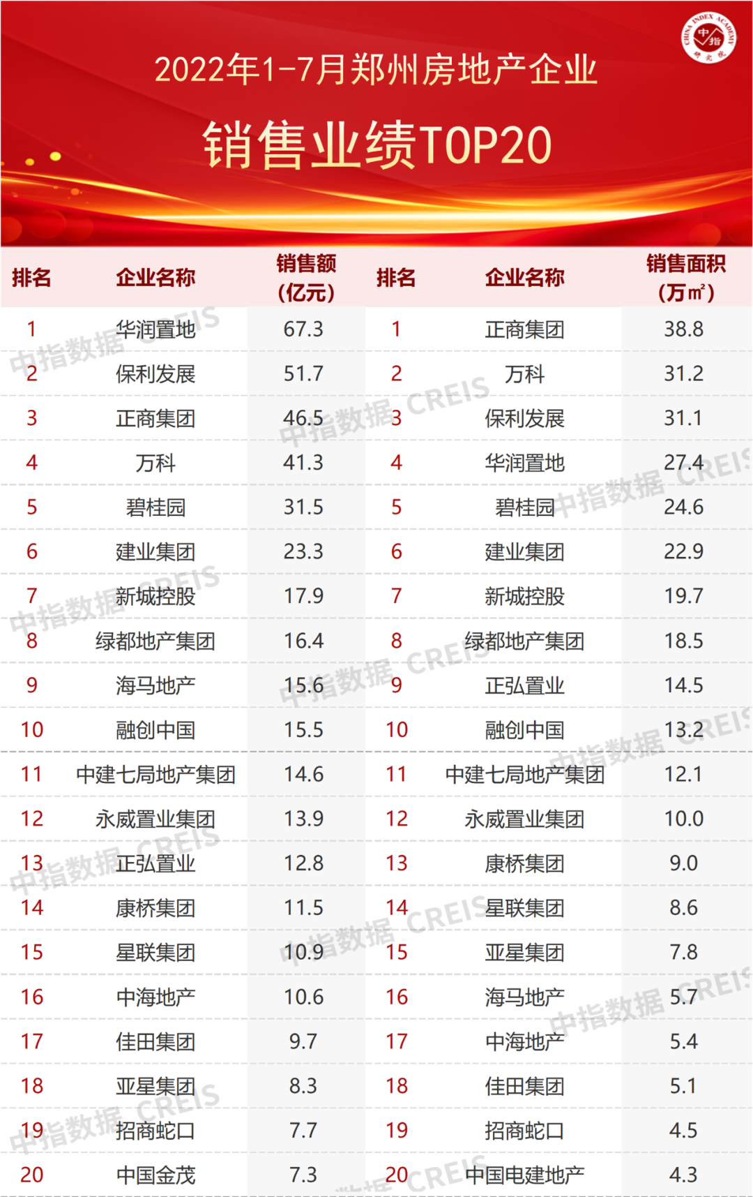 8月10日,中指研究院发布2022年1-7月郑州房地产企业销售业绩TOP20榜单。