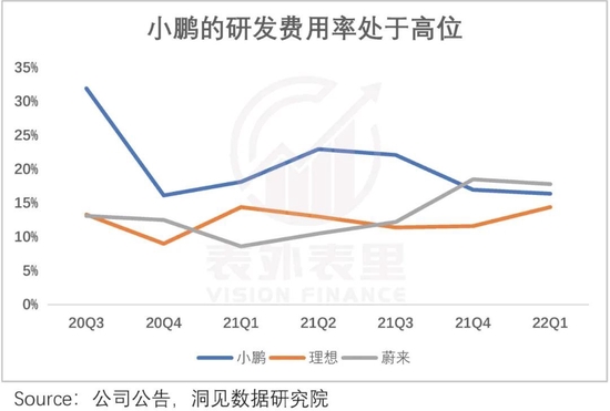 开源效果有限,节流也不太现实。可以看到,小鹏的研发费用支出比例,一直是三家中最高的。