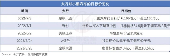 在资本市场上,更是频频遇冷。如下图,今年三月以来小鹏汽车相继被华尔街的机构降价调级。