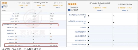 续航:低配小鹏P5续航里程仅450km;相同价位的比亚迪秦 plus EV 或广汽 Aion S plus,可达600km;