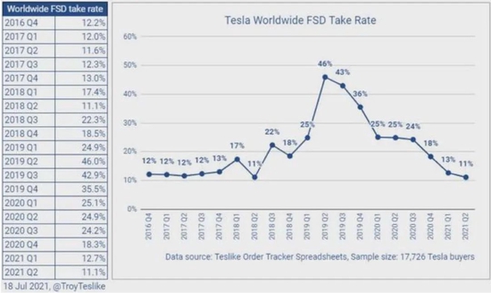 目前整个行业,都还处于低等级的自动驾驶。可以看到,同以智能化为卖点的特斯拉,2021Q2 FSD全球渗透率也仅为11%。其中,以中国和欧洲最不捧场。