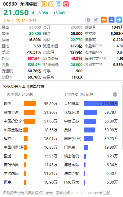 华盛资讯8月10日消息,港股地产股午后持续下挫,龙湖集团跌15.8%,报21.05港元每股,股价创近三年新低;成交额3.05亿港元,单日蒸发超200亿市值,最新市值1279亿港元。根据实时数据,外资在持续卖出龙湖,大和、高盛、花旗等外资卖出居首。